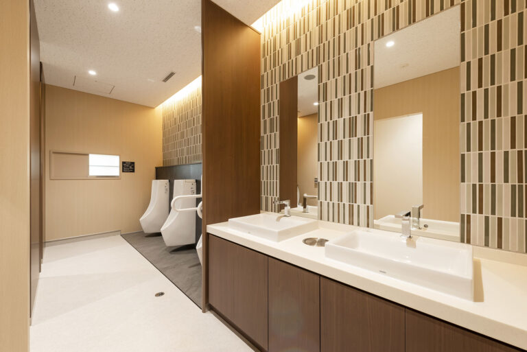 内部は明るく開放的な“共用ホール”を拠点として健診が受けられる明快な動線でわかりやすい健診フロアとなり、田園風景や並木を望む“待合ホール”は自然を感じられる心地よい空間となっています。また、木調の壁パネルを適所に採用し、明るく温かみのある落ち着いた空間で、健診や待ち時間にリラックスしていただけるデザイン計画です。